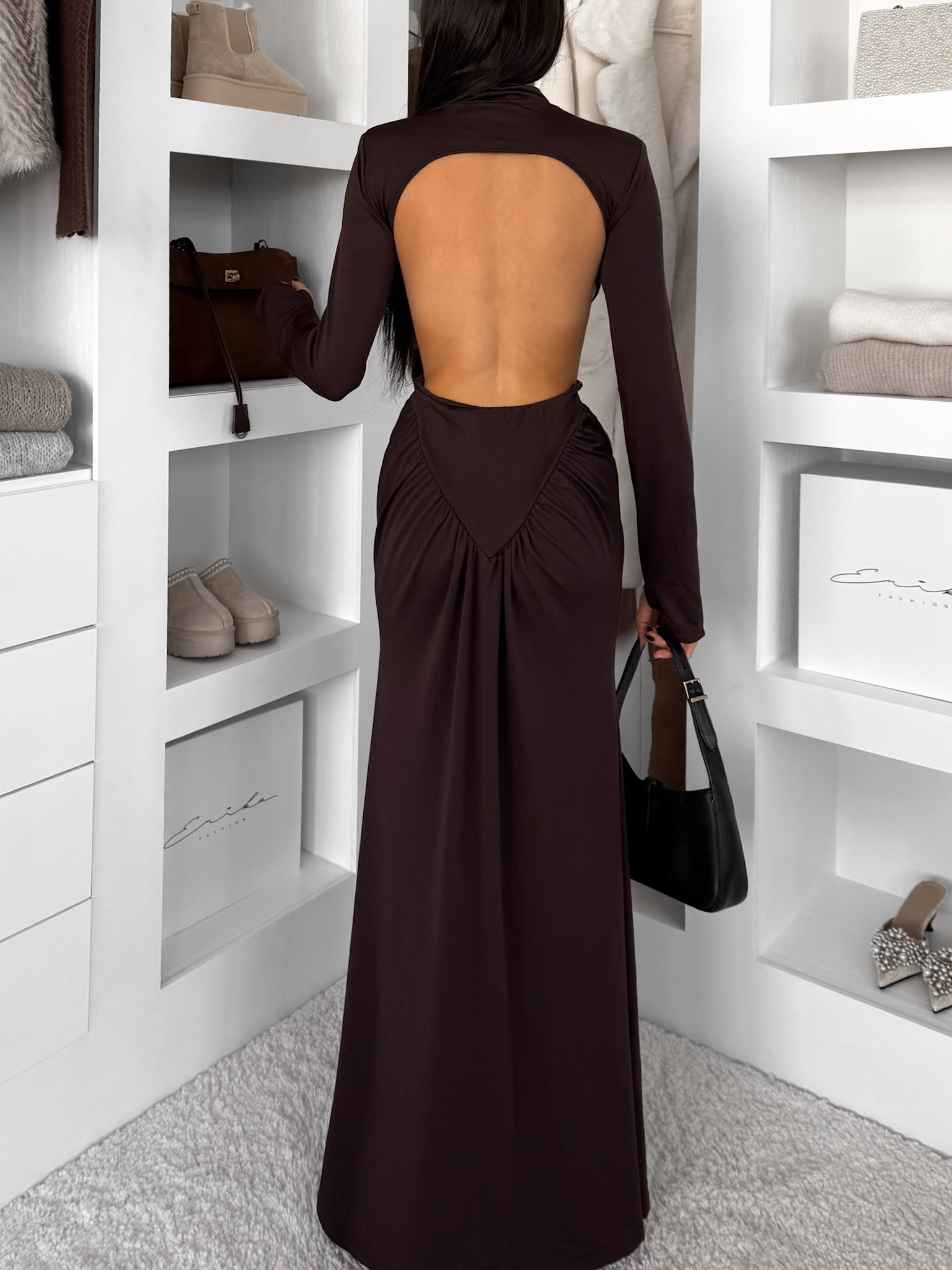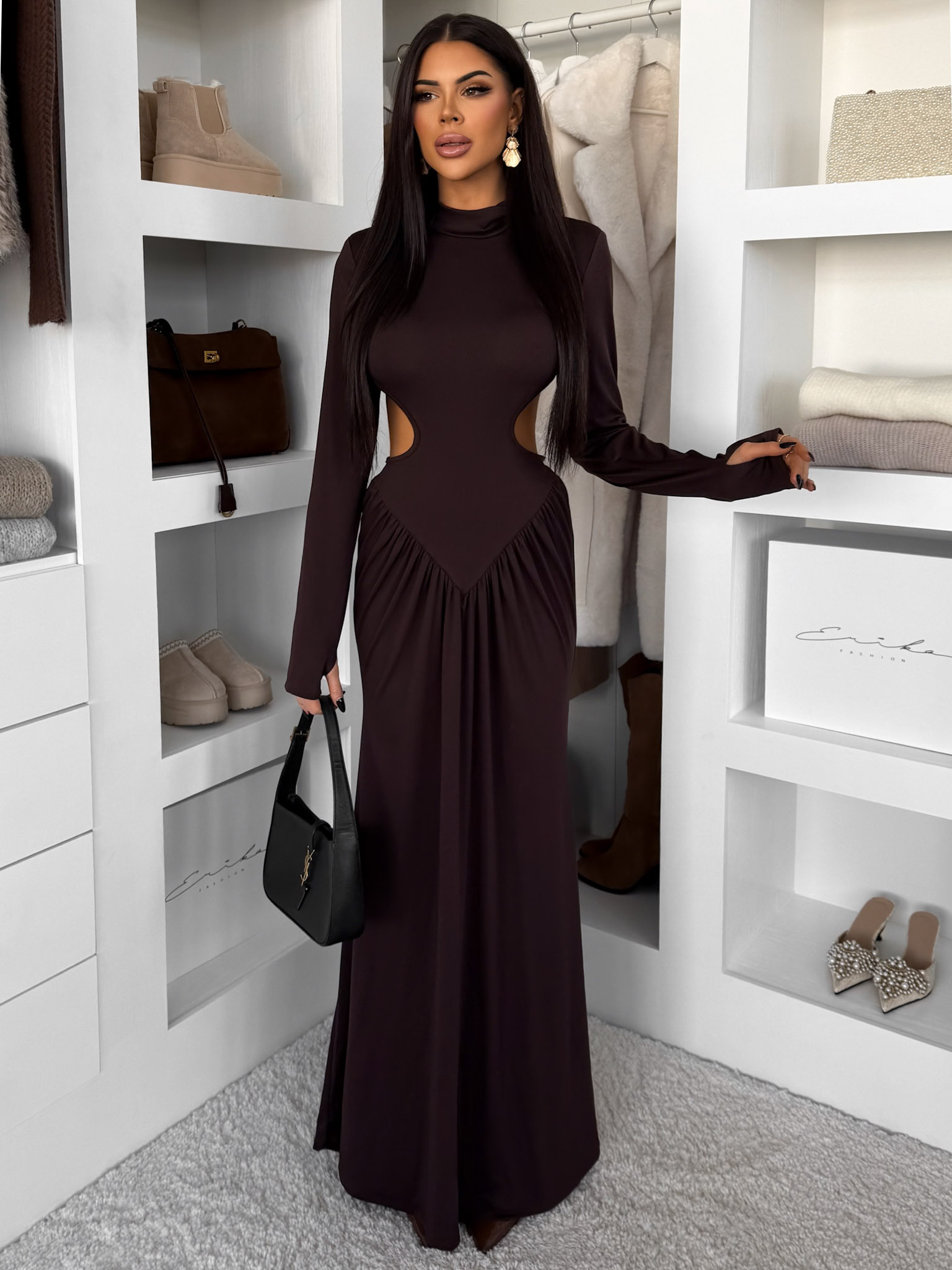 Tmavě hnědé dlouhé společenské šaty EVANIE s průstřihy Velikost: ONESIZE