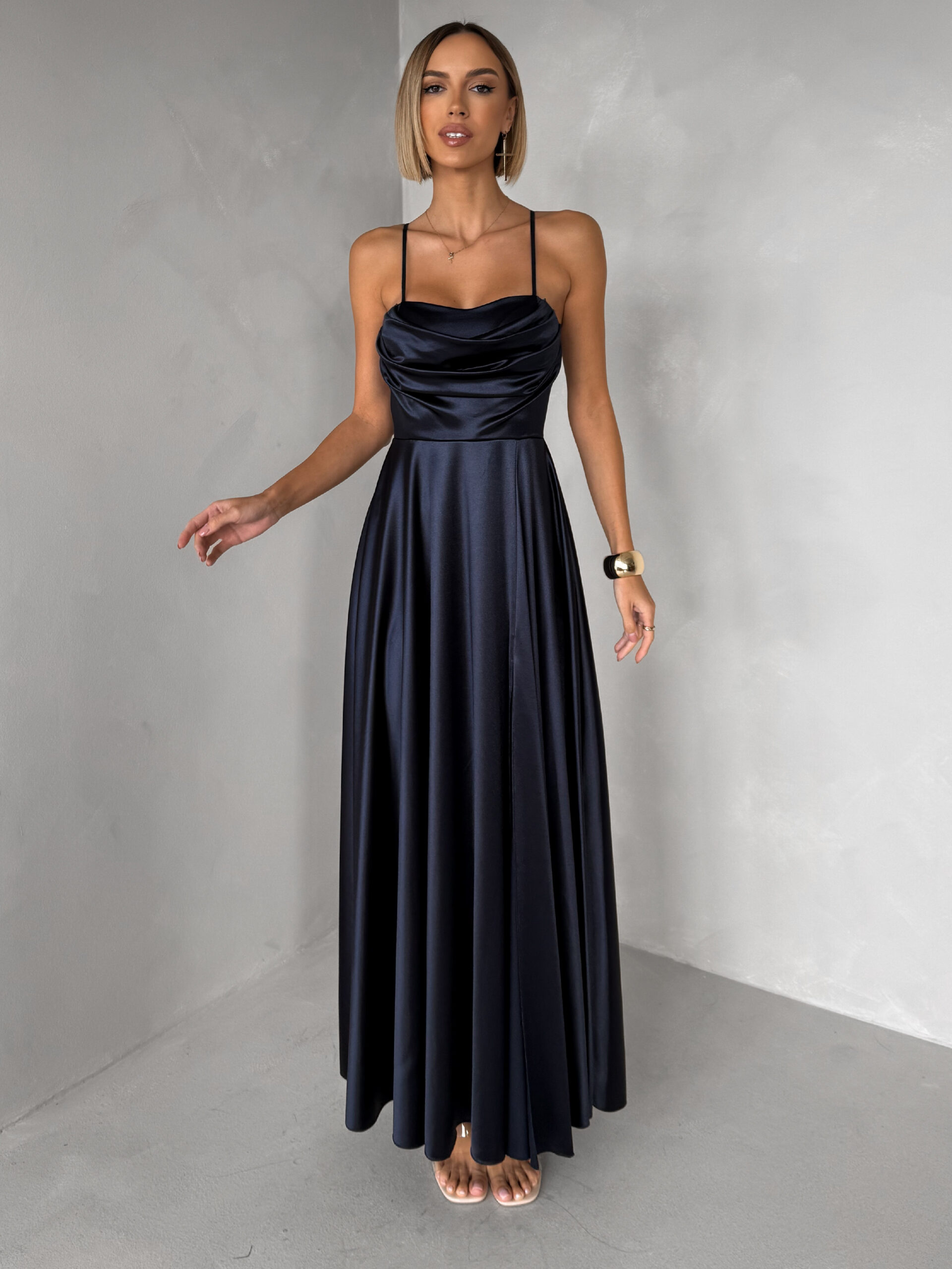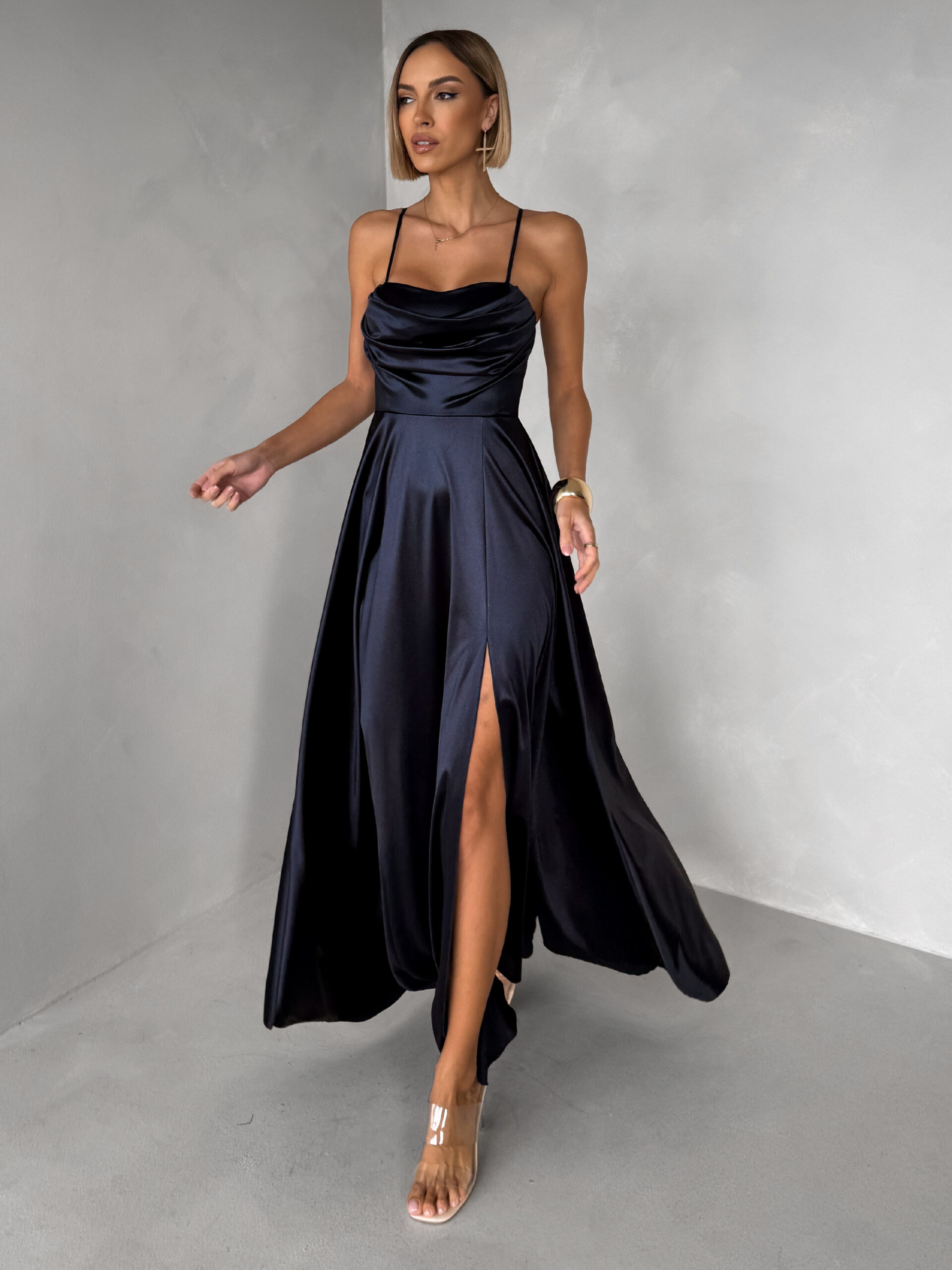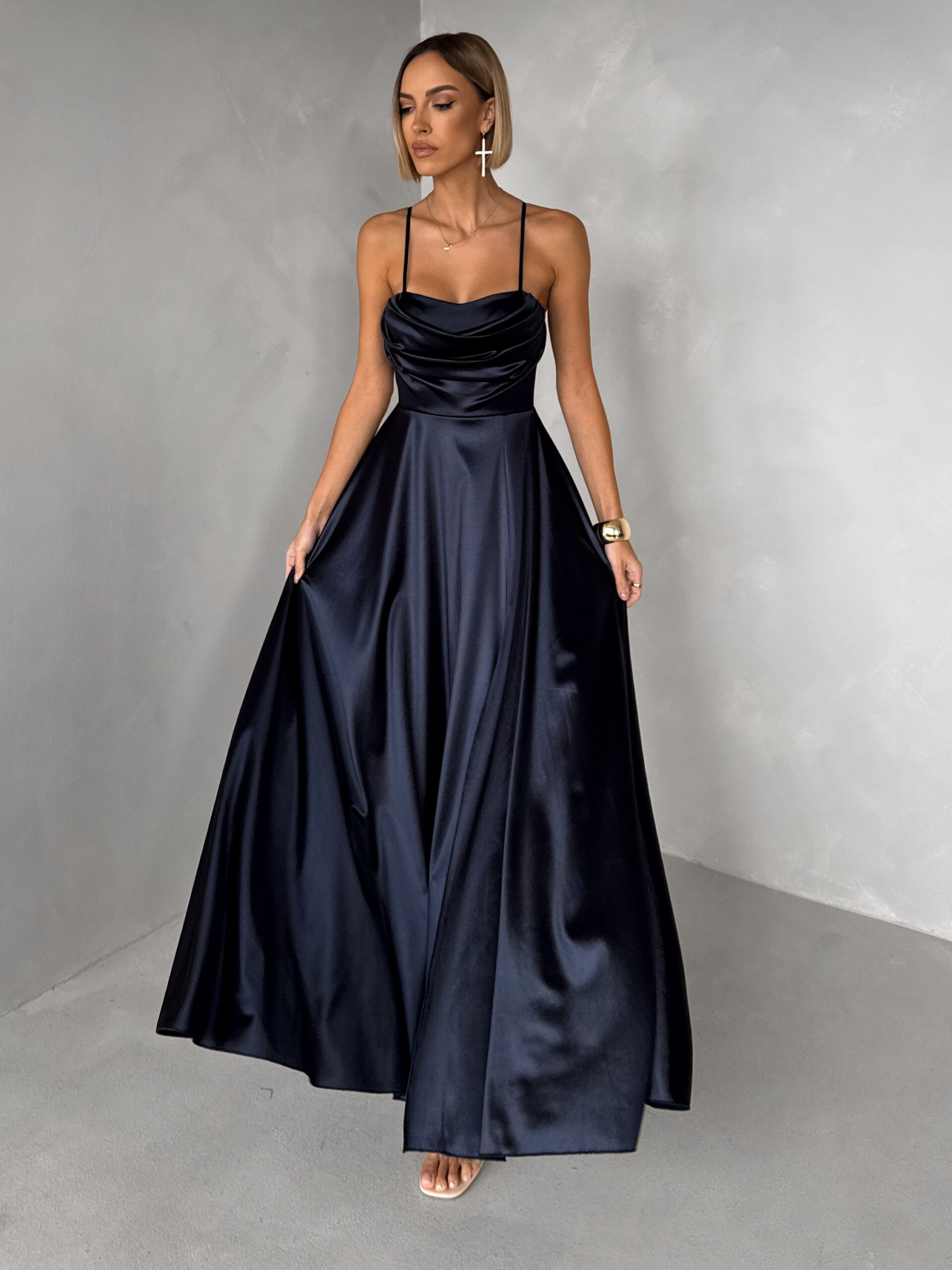 Tmavě modré saténové dlouhé společenské šaty LUNOREX Velikost: ONESIZE