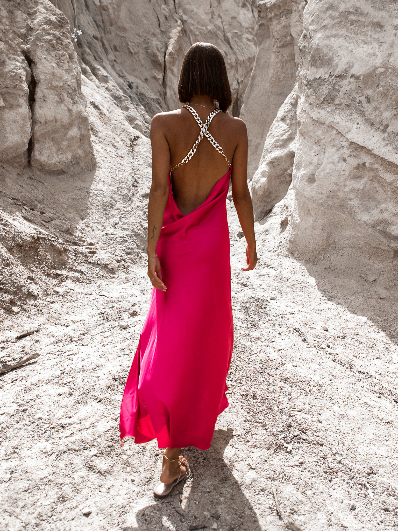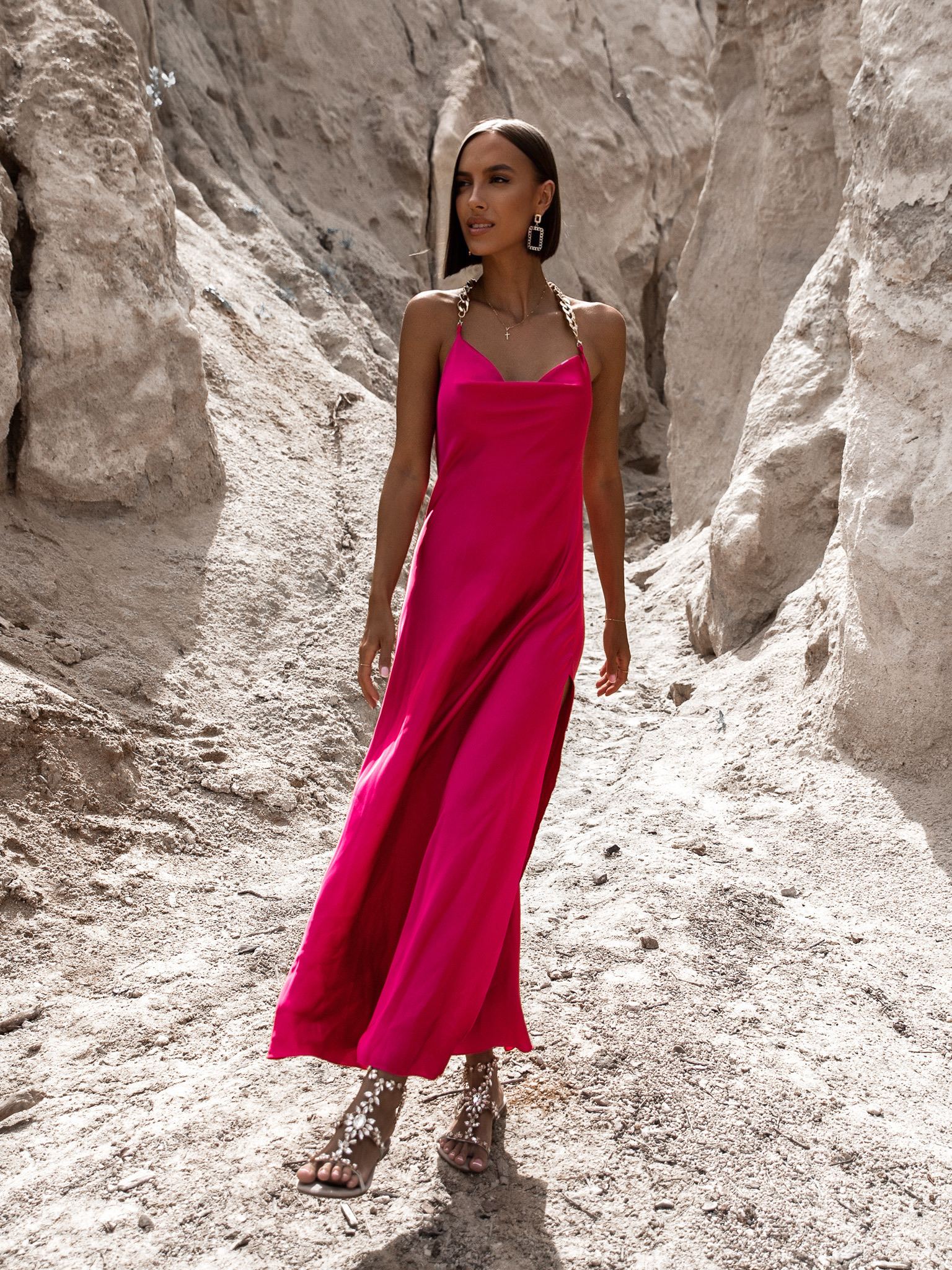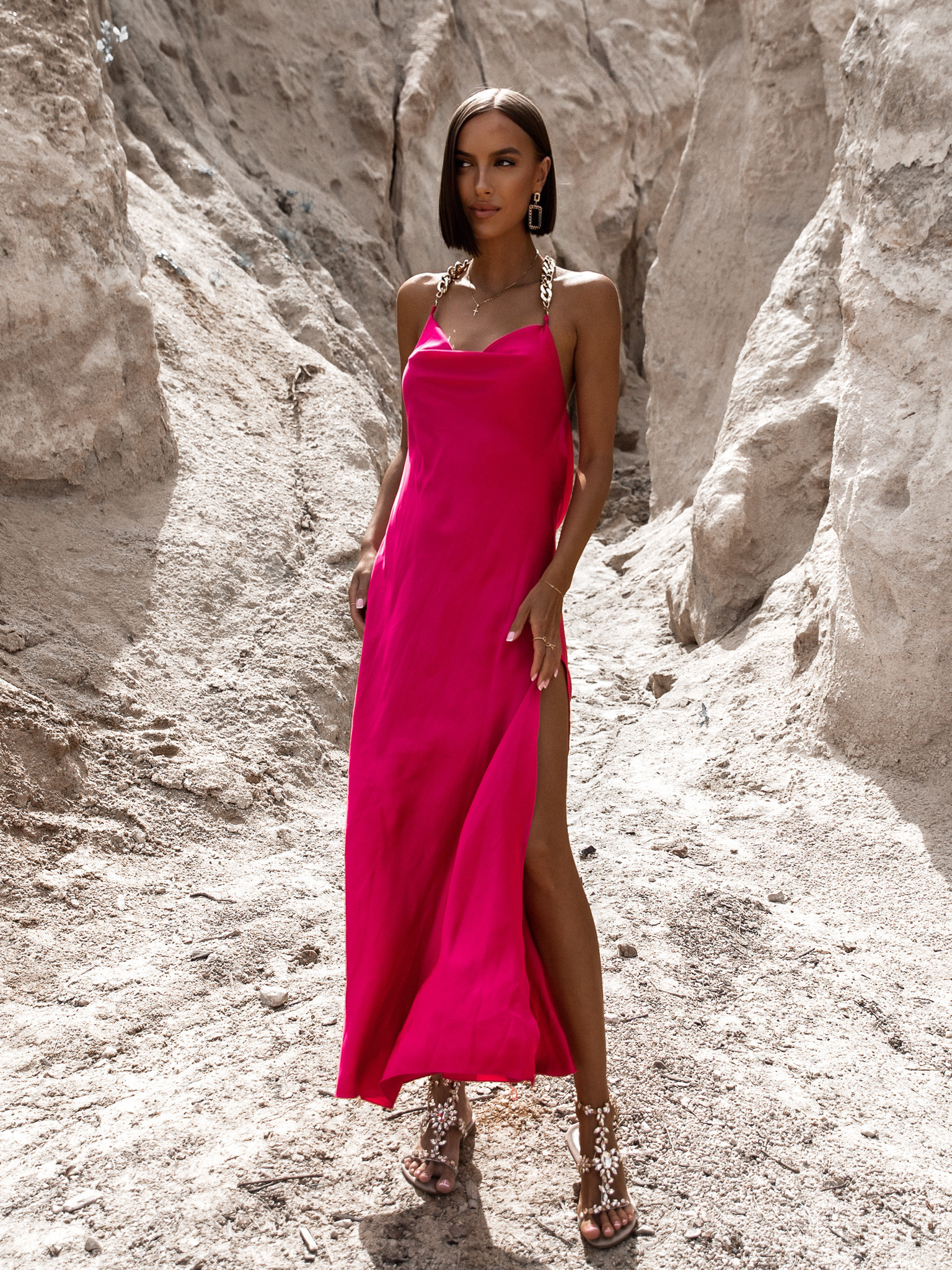 Tmavě růžové lesklé elegantní šaty MENLEYS se zlatými ramínky