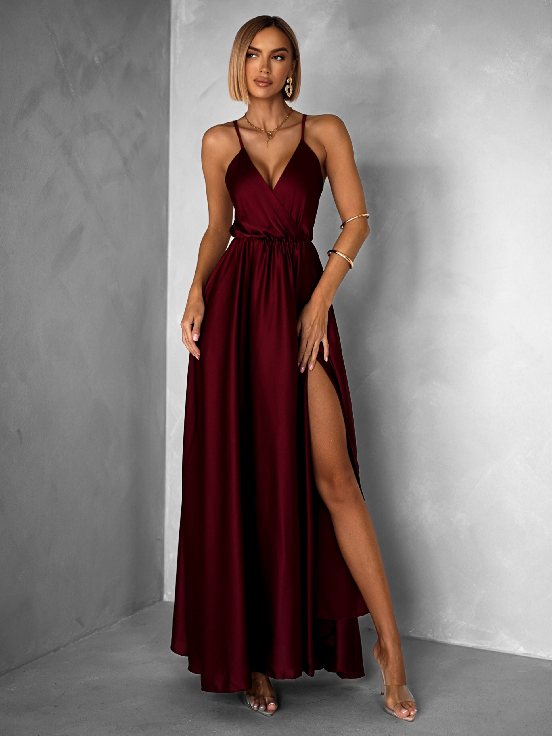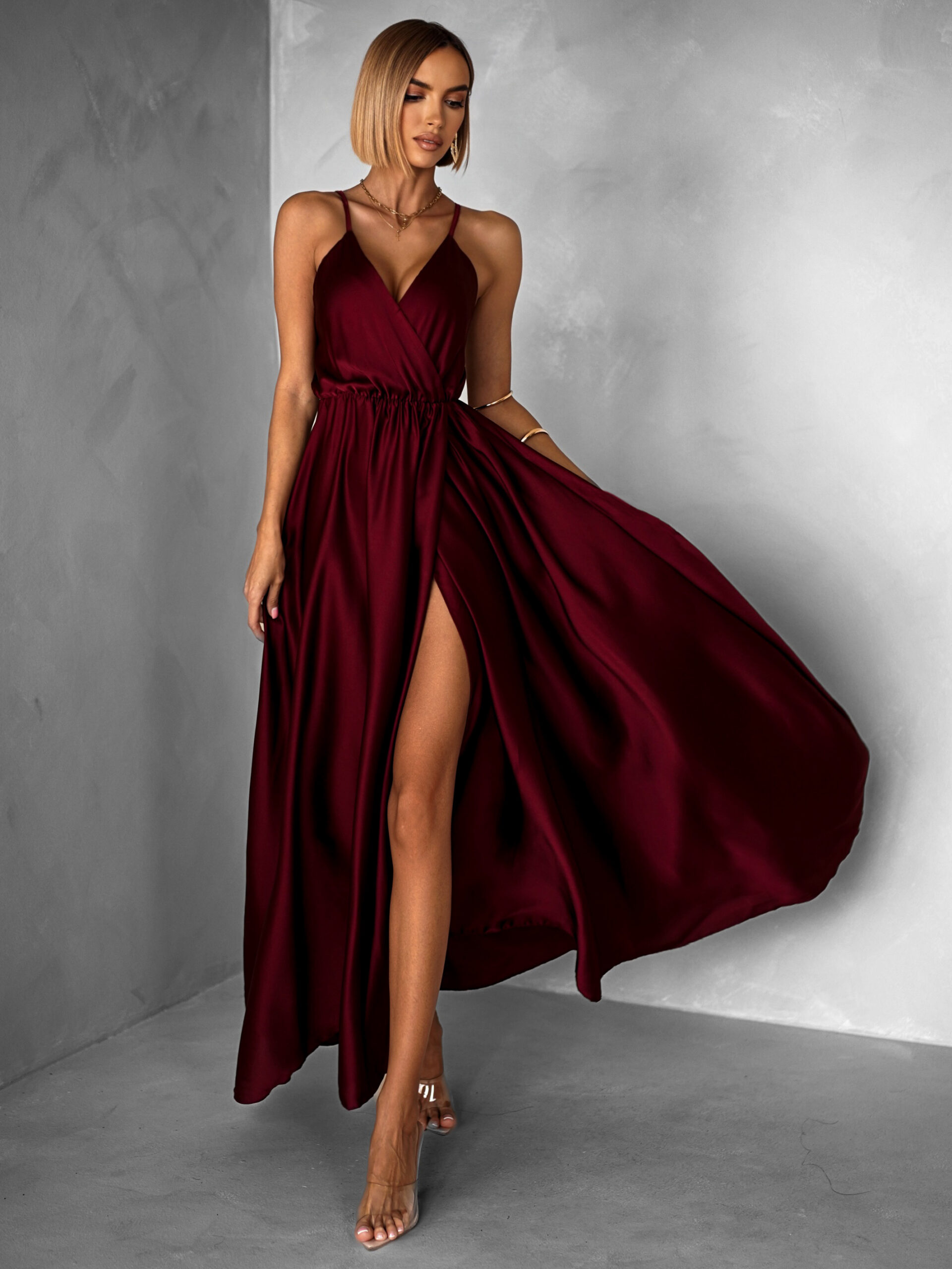 Vínové dlouhé saténové šaty PERFECTLY Velikost: ONESIZE
