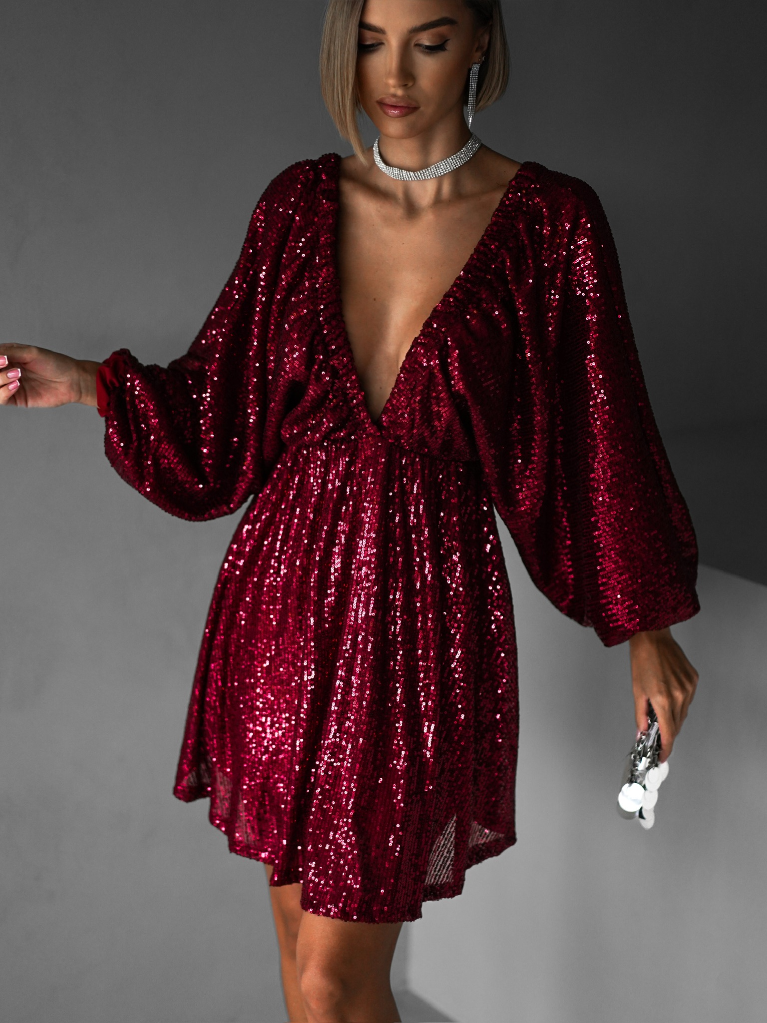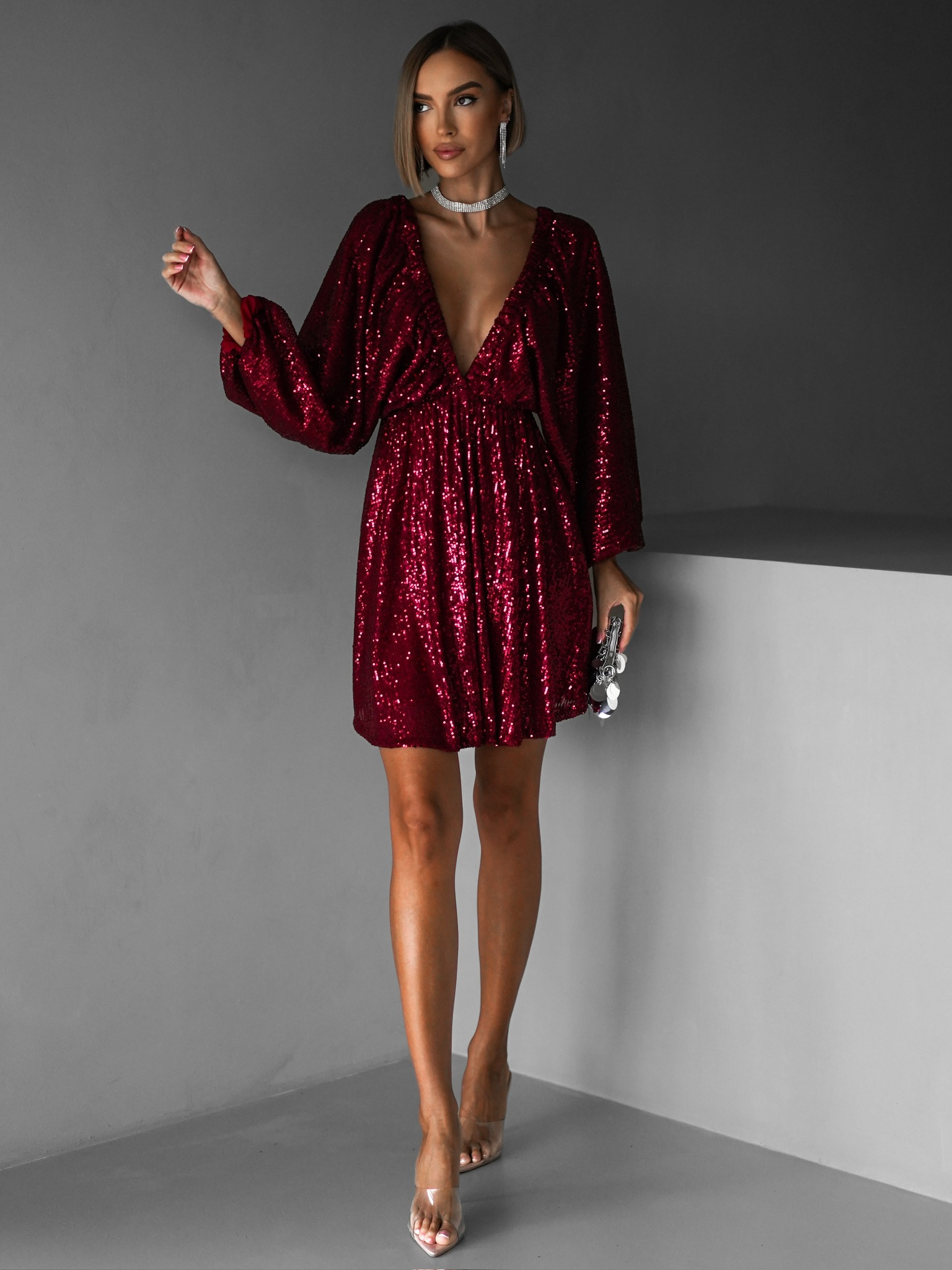 Vínové krátké flitrované šaty BERRON s výstřihem Velikost: ONESIZE