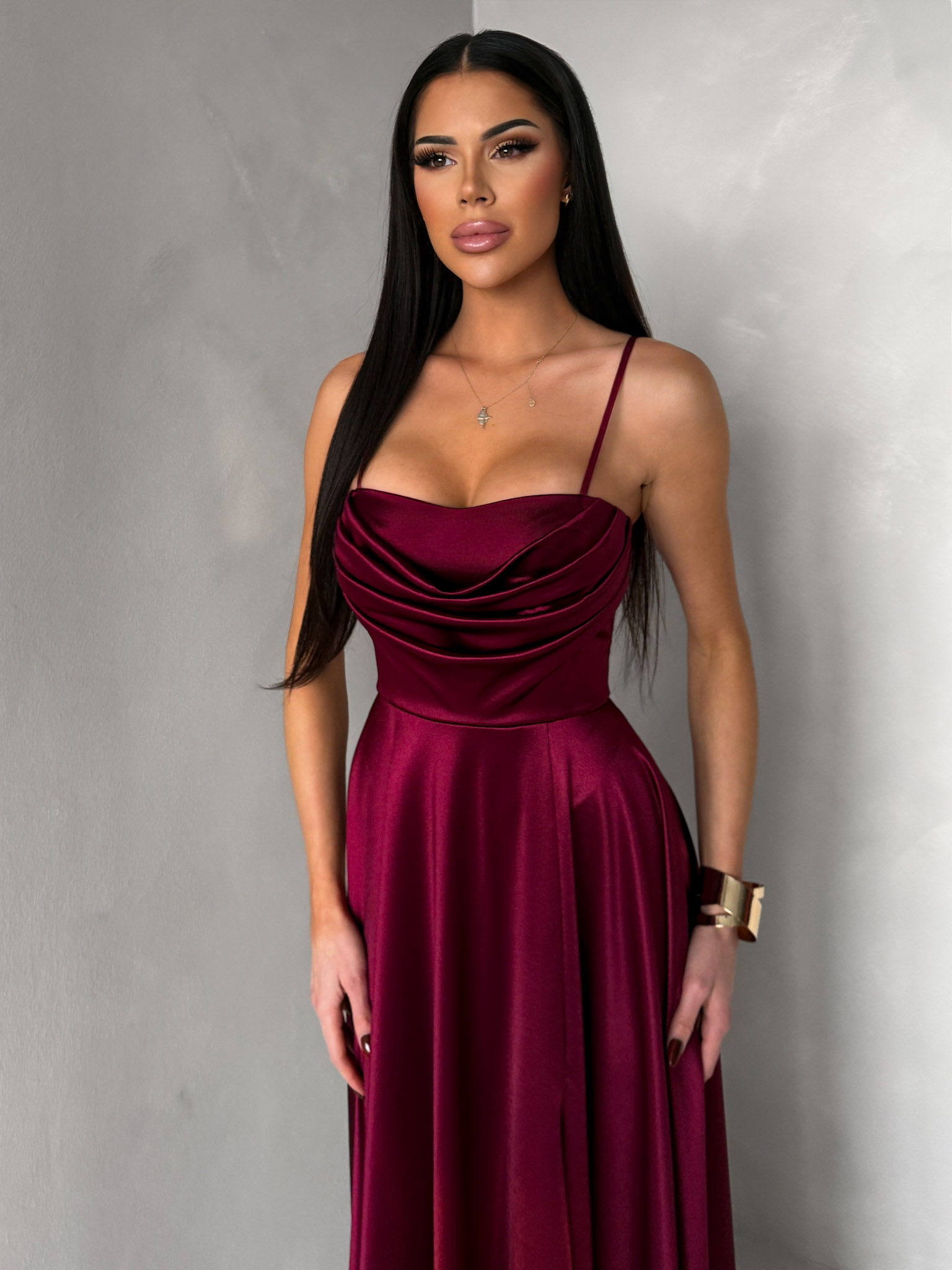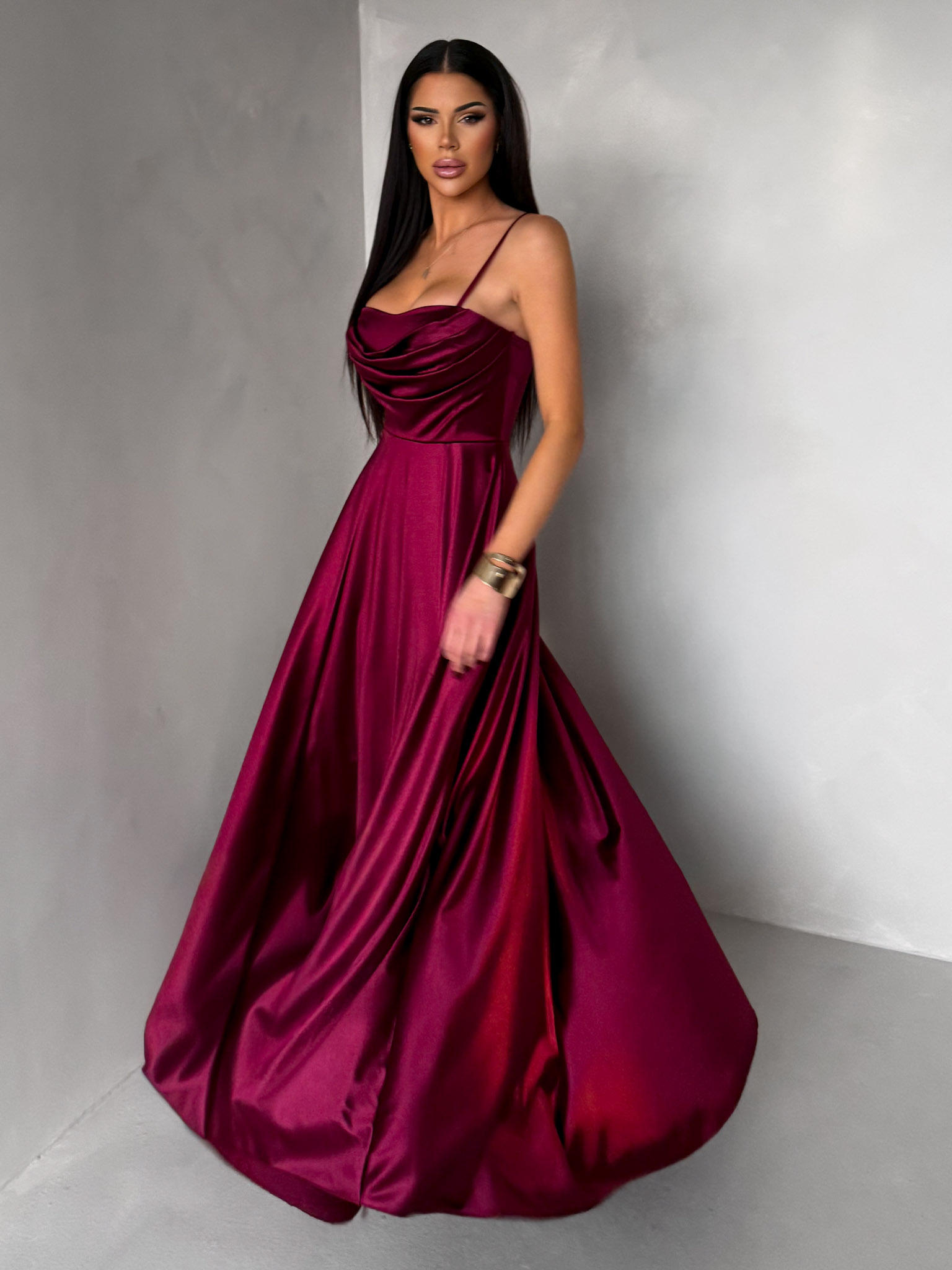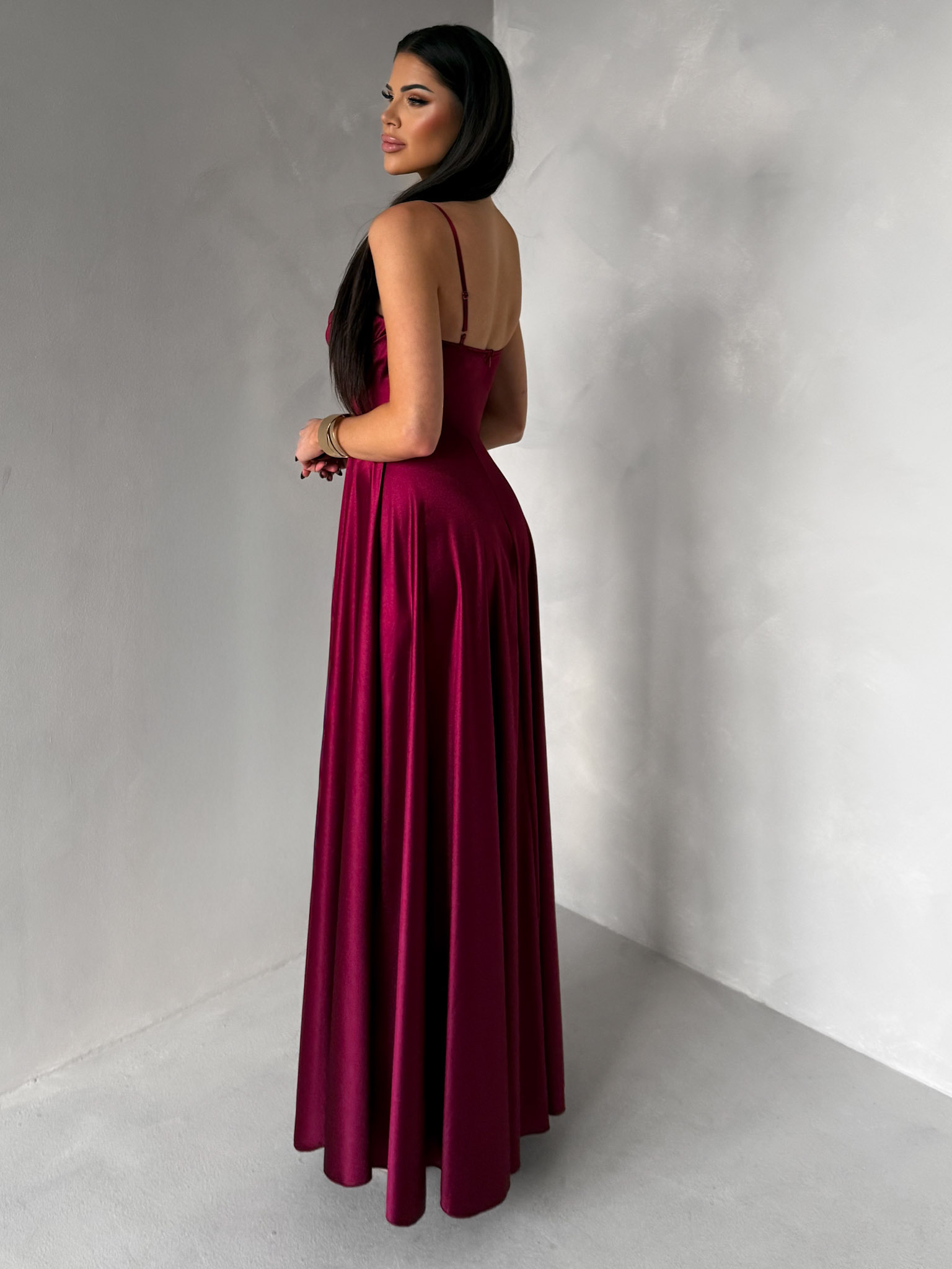Vínové saténové dlouhé společenské šaty LUNOREX Velikost: ONESIZE
