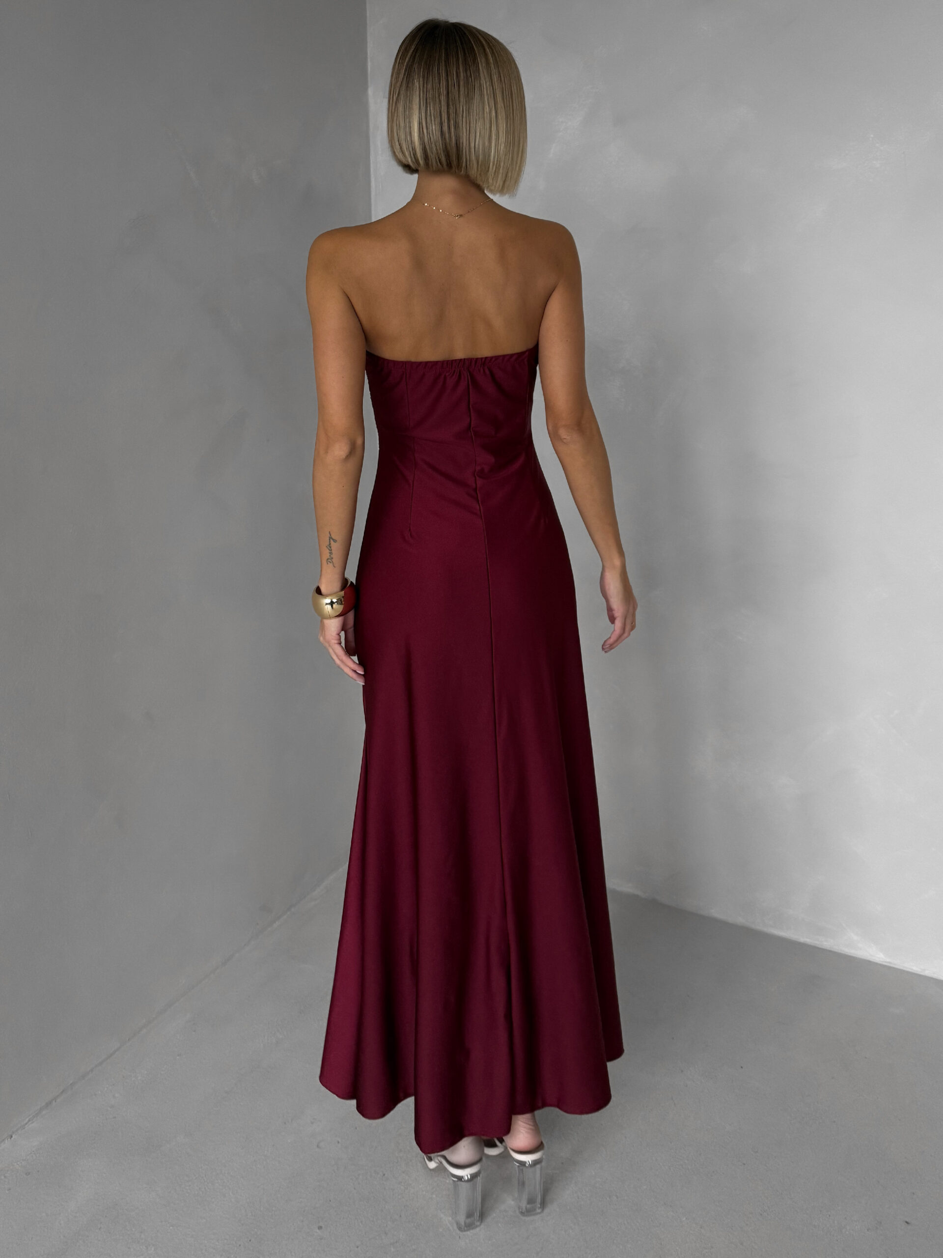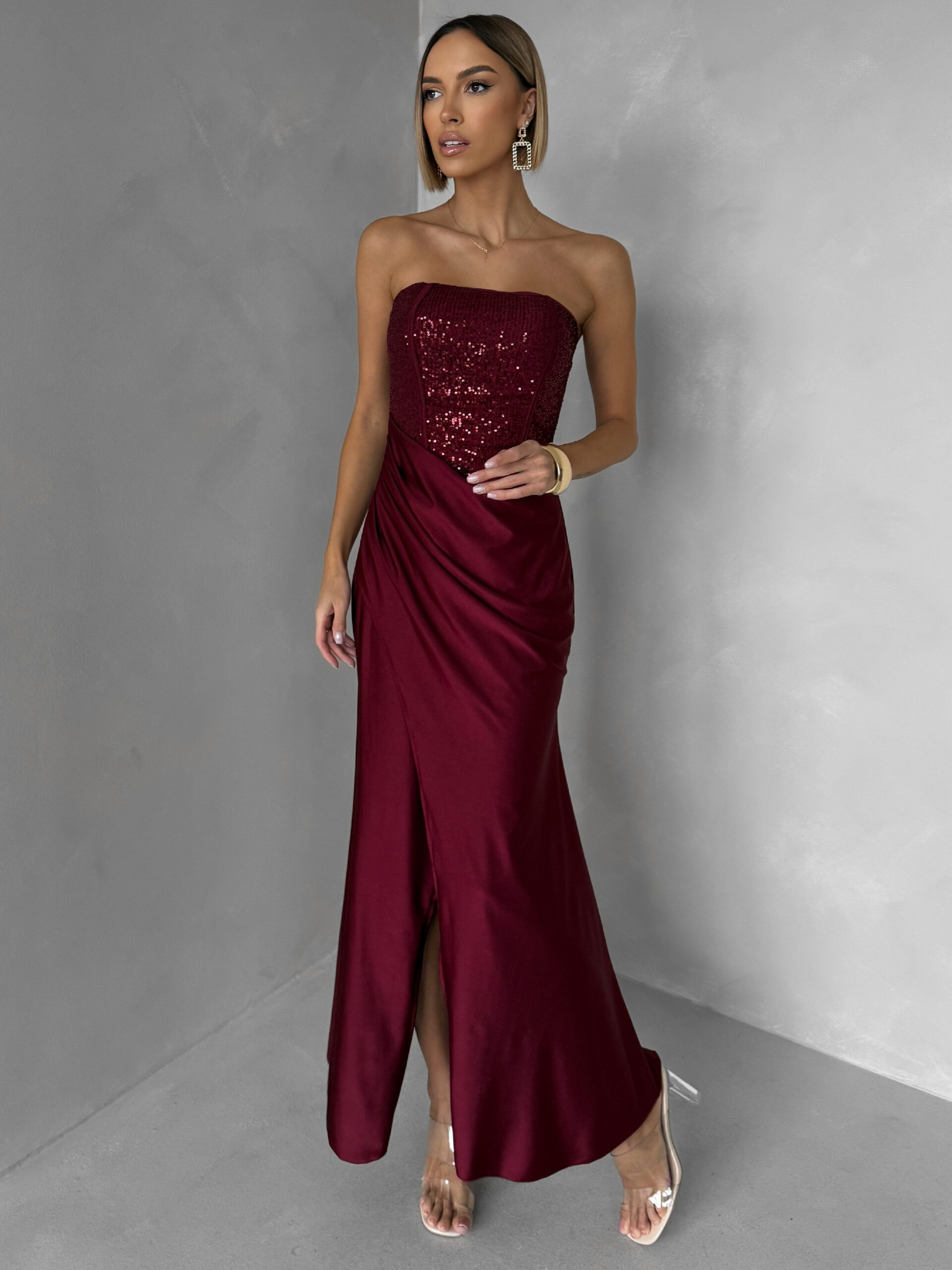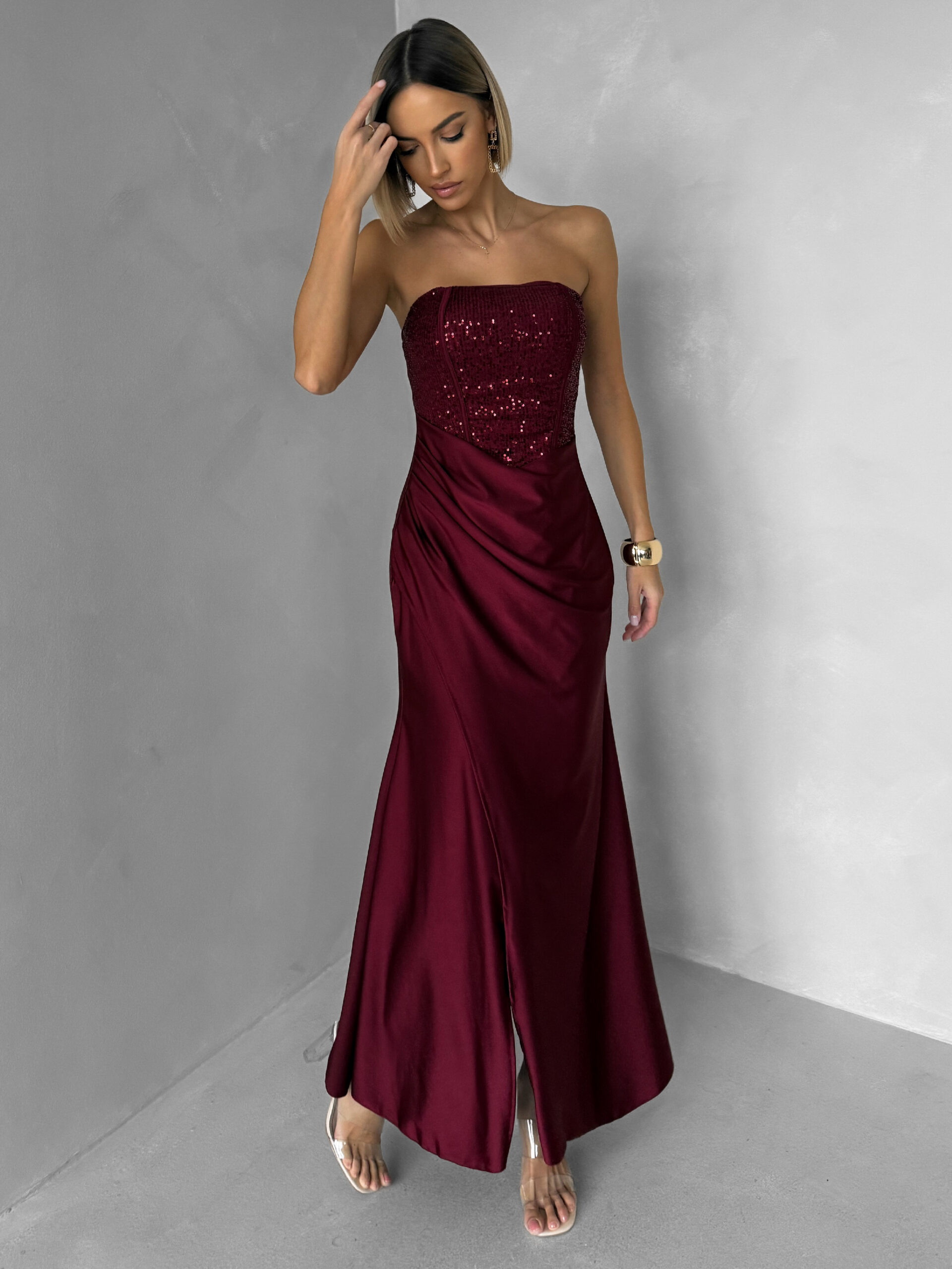 Vínové třpytivé korzetové společenské šaty AVENZA s rozparkem Velikost: ONESIZE