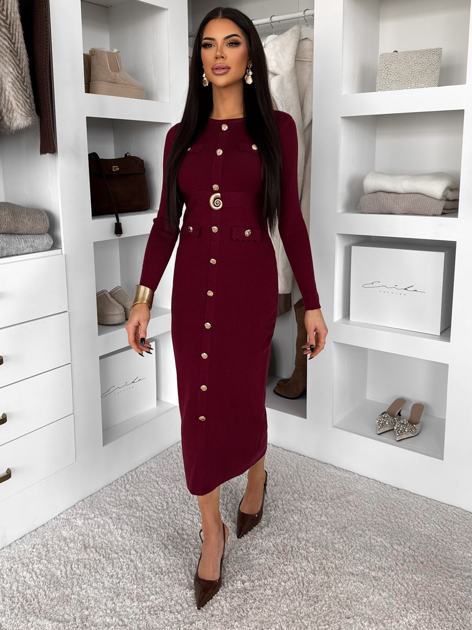 Vínové úpletové elegantní šaty CRESTILO s dlouhým rukávem Velikost: M/L