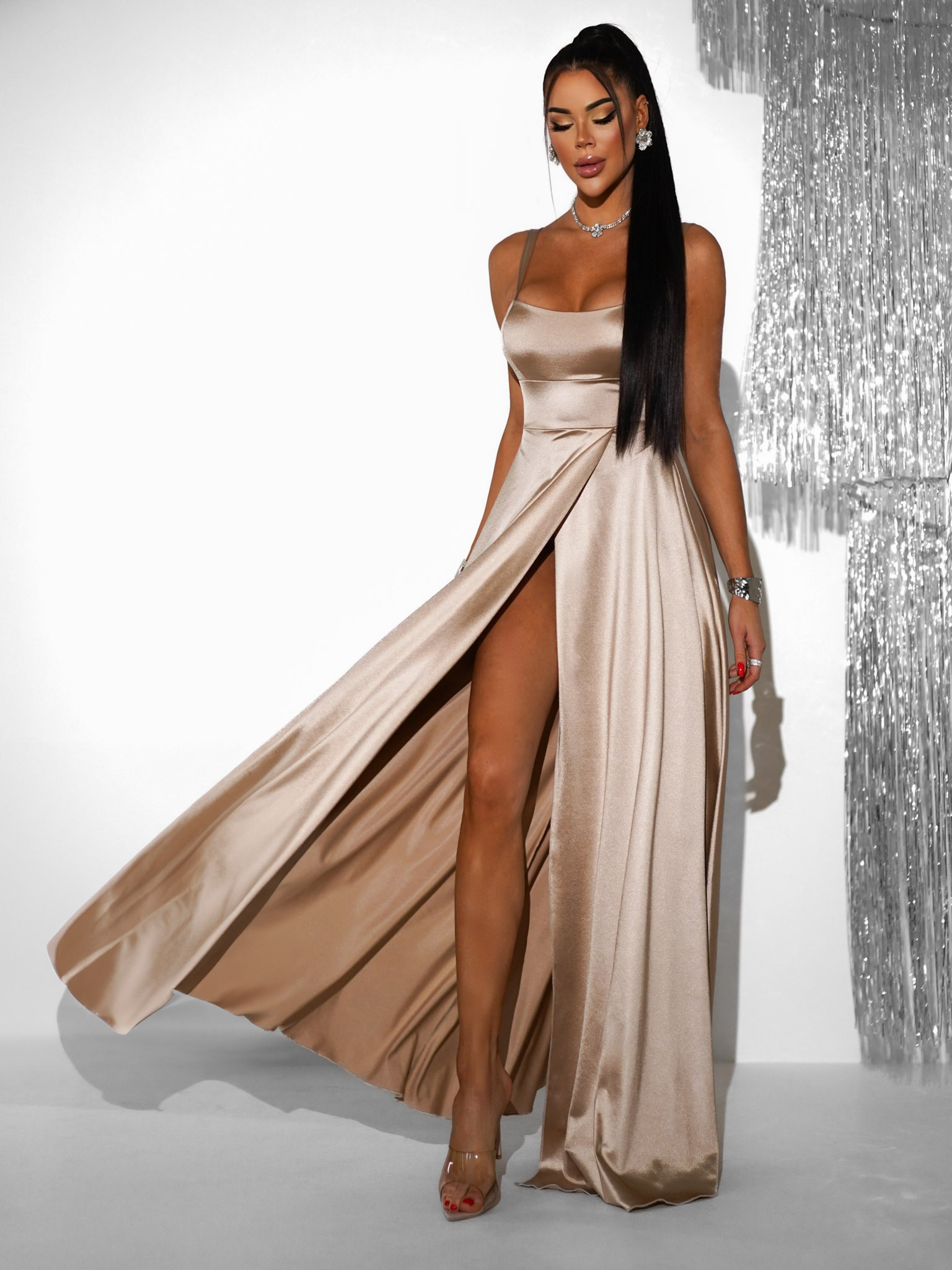 Zlaté dlouhé saténové šaty HELSIN s rozparkem Velikost: ONESIZE