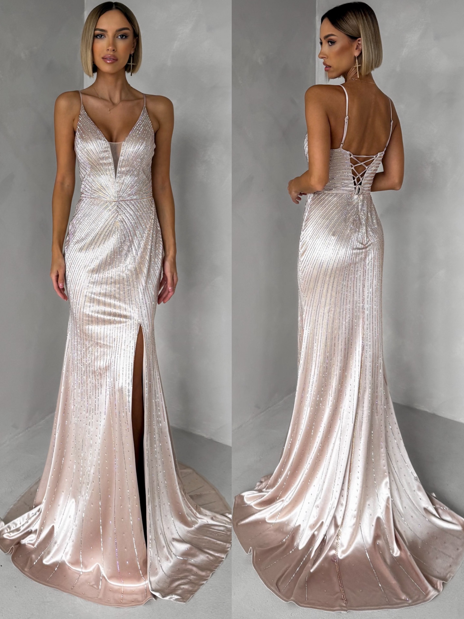 Zlaté plesové třpytivé společenské šaty RAVELLE s rozparkem Velikost: M
