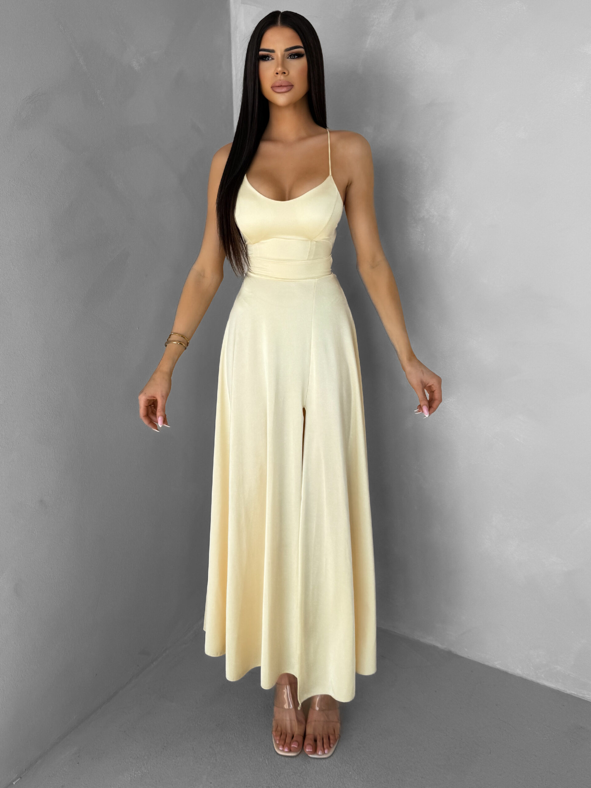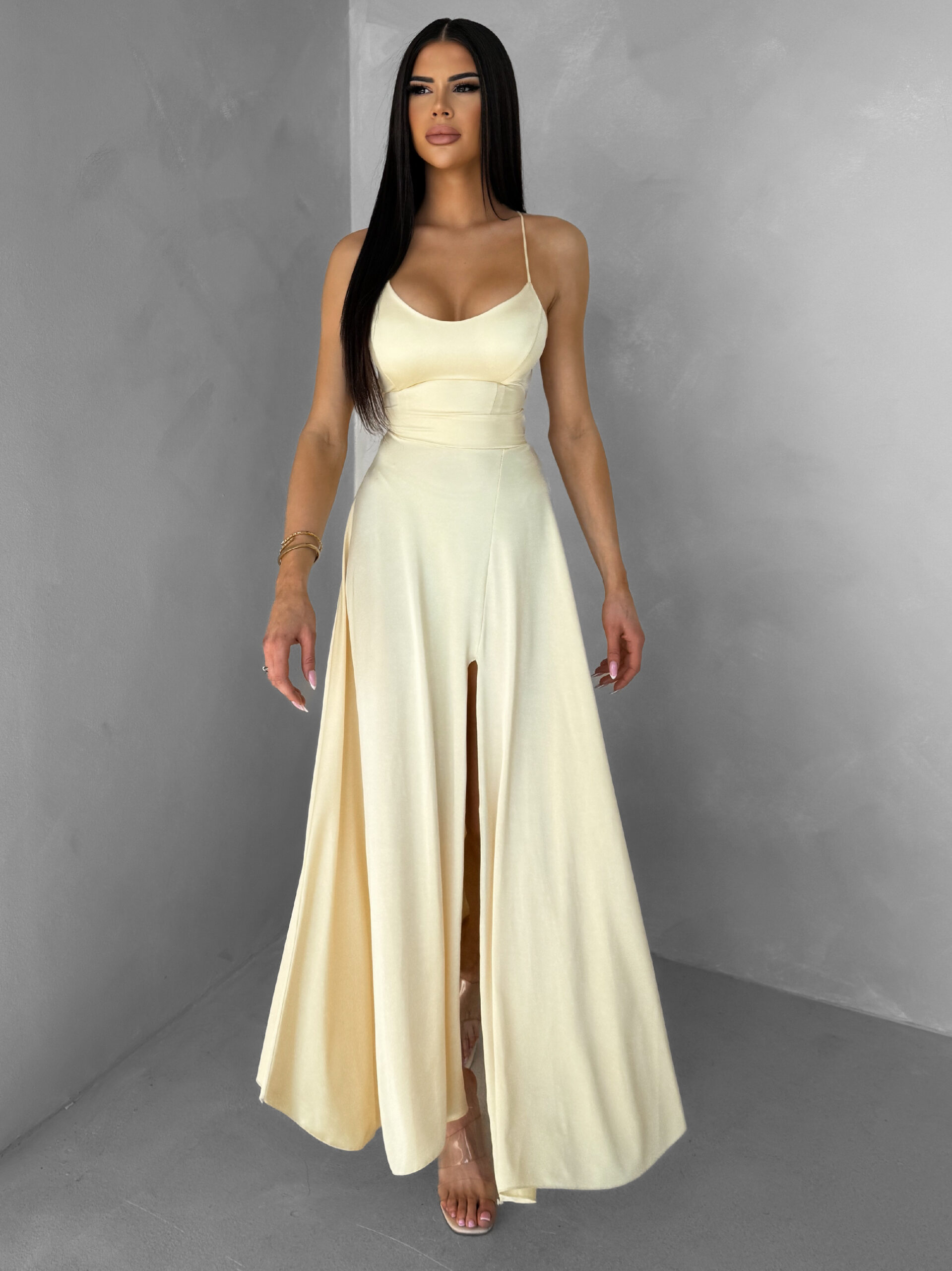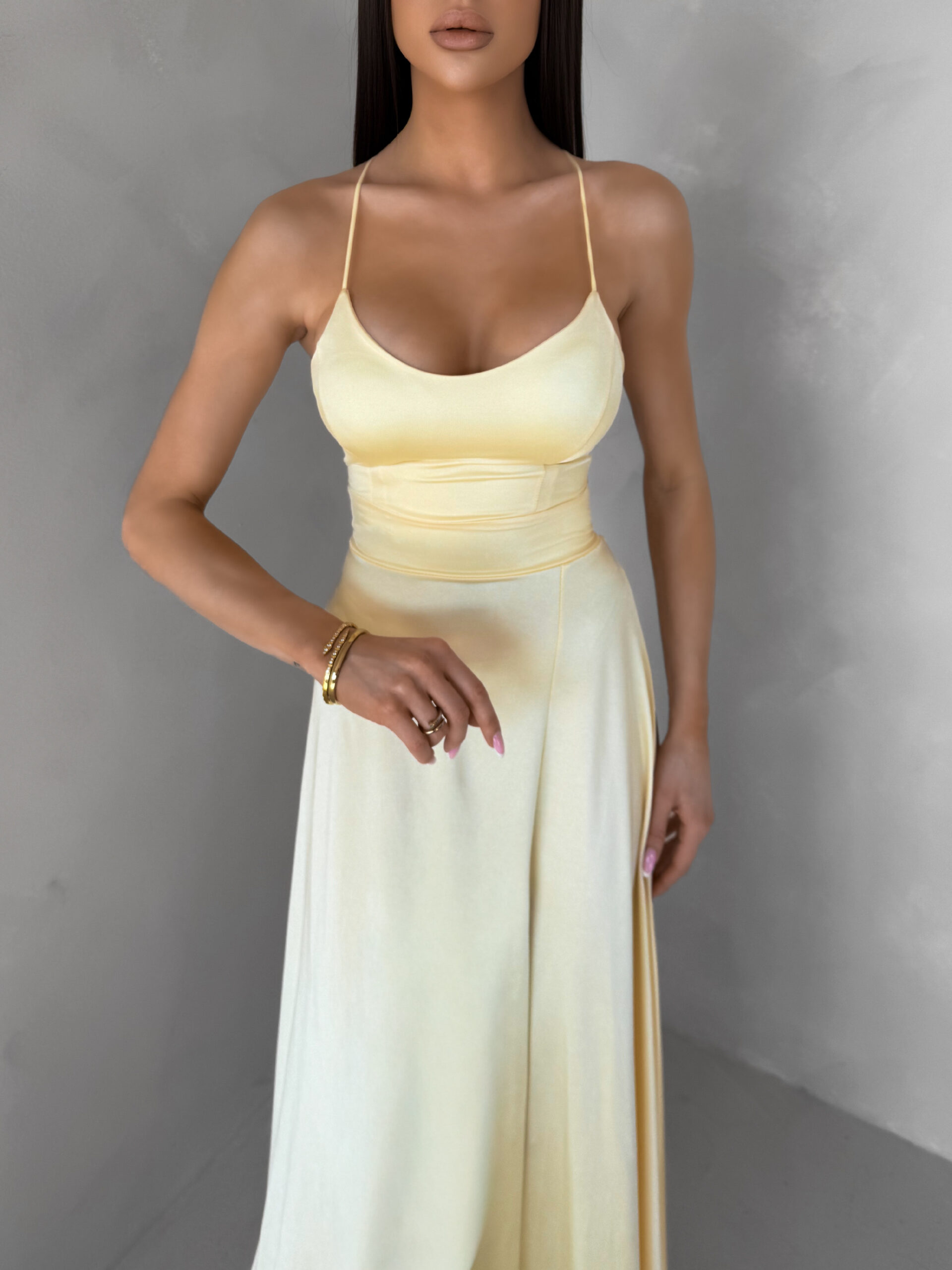 Žluté saténové elegantní midi šaty SIMUEL se šněrováním Velikost: ONESIZE